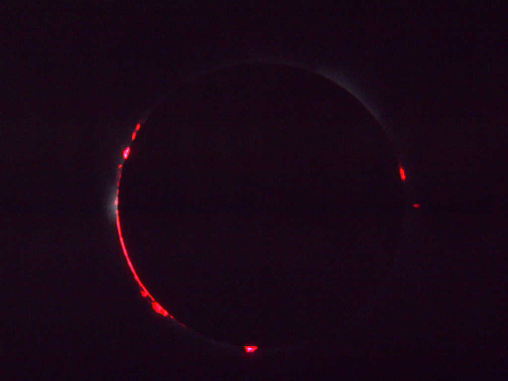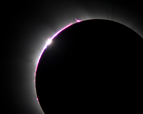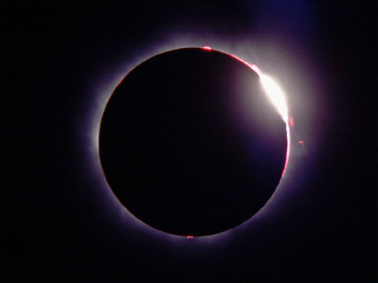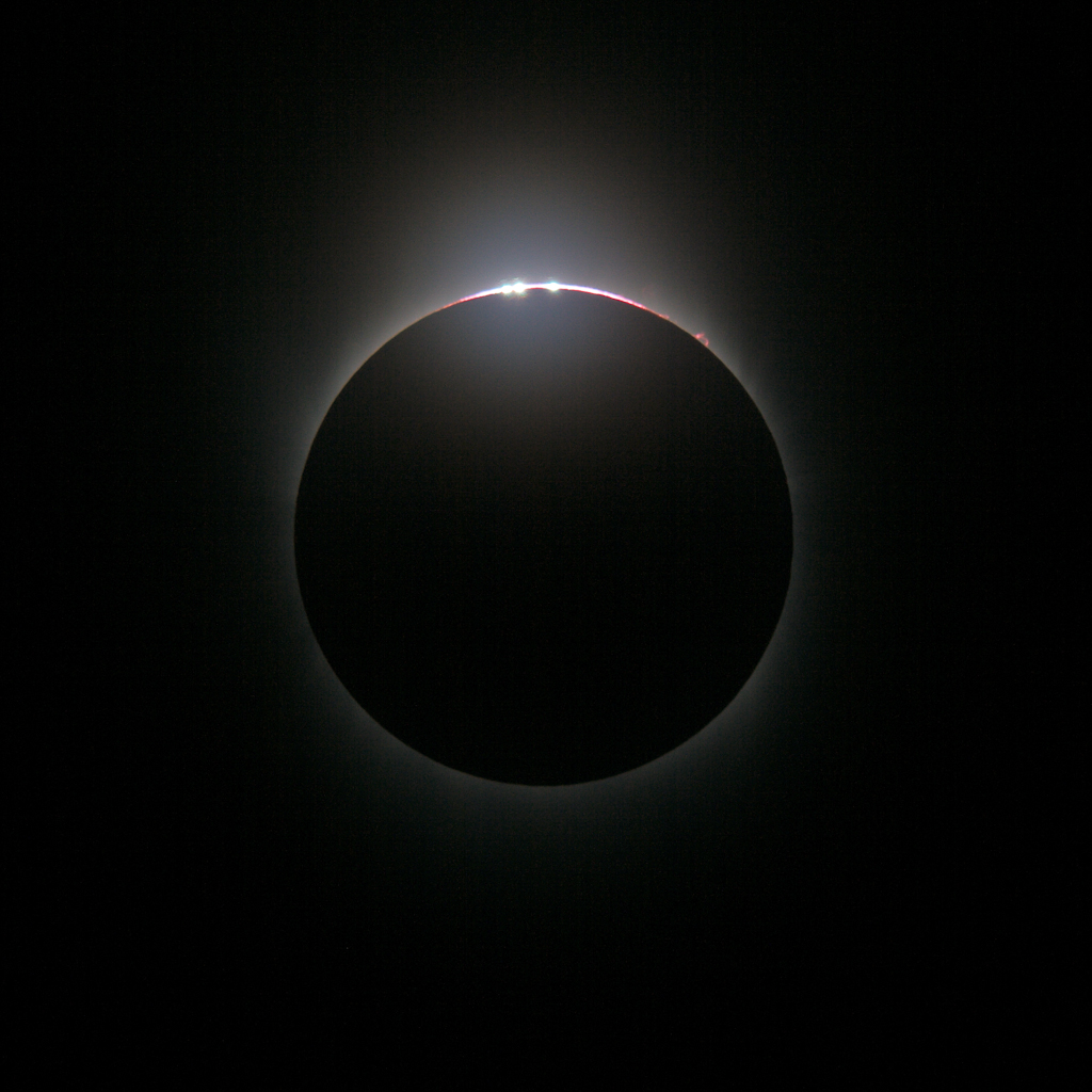 Prominences, the chromosphere, and Baily's beads can be seen.